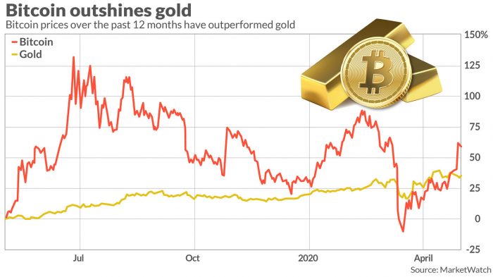 График показывает, что биткоин был доходнее золота в 2020 году