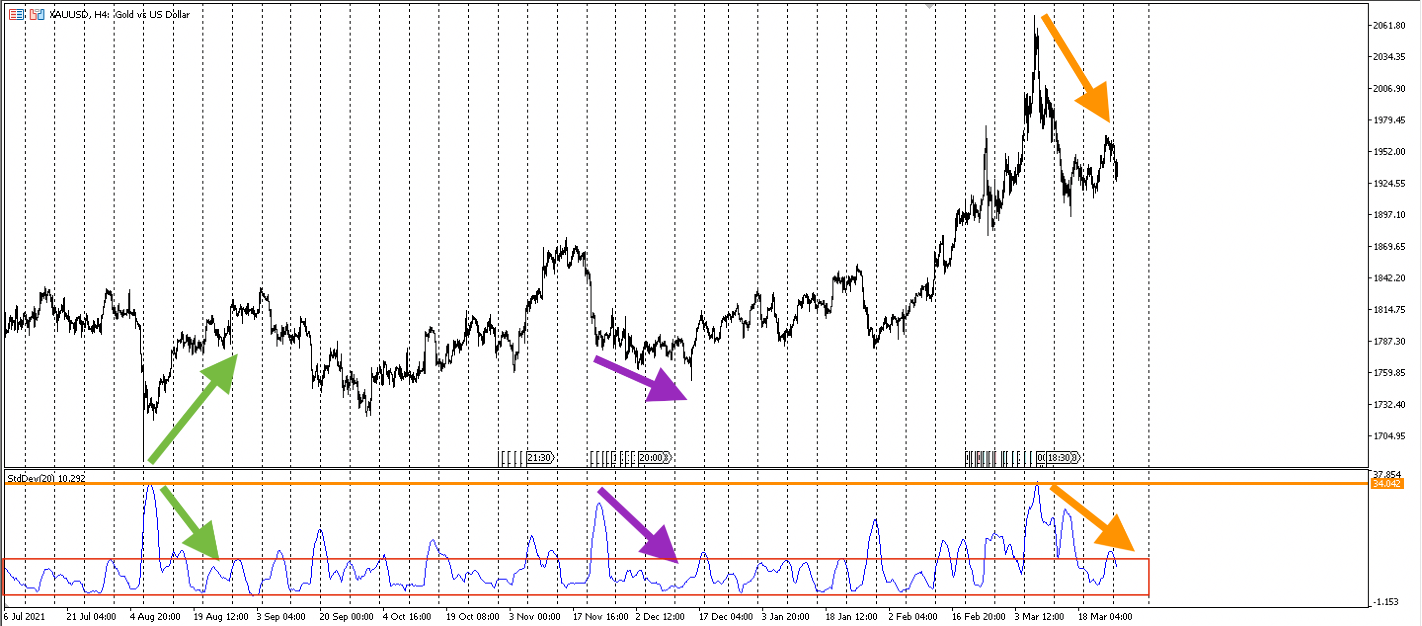 Динамика котировок XAU/USD и индикатора Standard Deviation (20) с 6 июля 2021 г. по 28 марта 2022 г., торговый терминал MetaTrader 5, свечи H4. Дата обращения: 28 марта 2022 г. Котировки предоставлены международным брокером AMarkets. Данная информация не является инвестиционным советом.