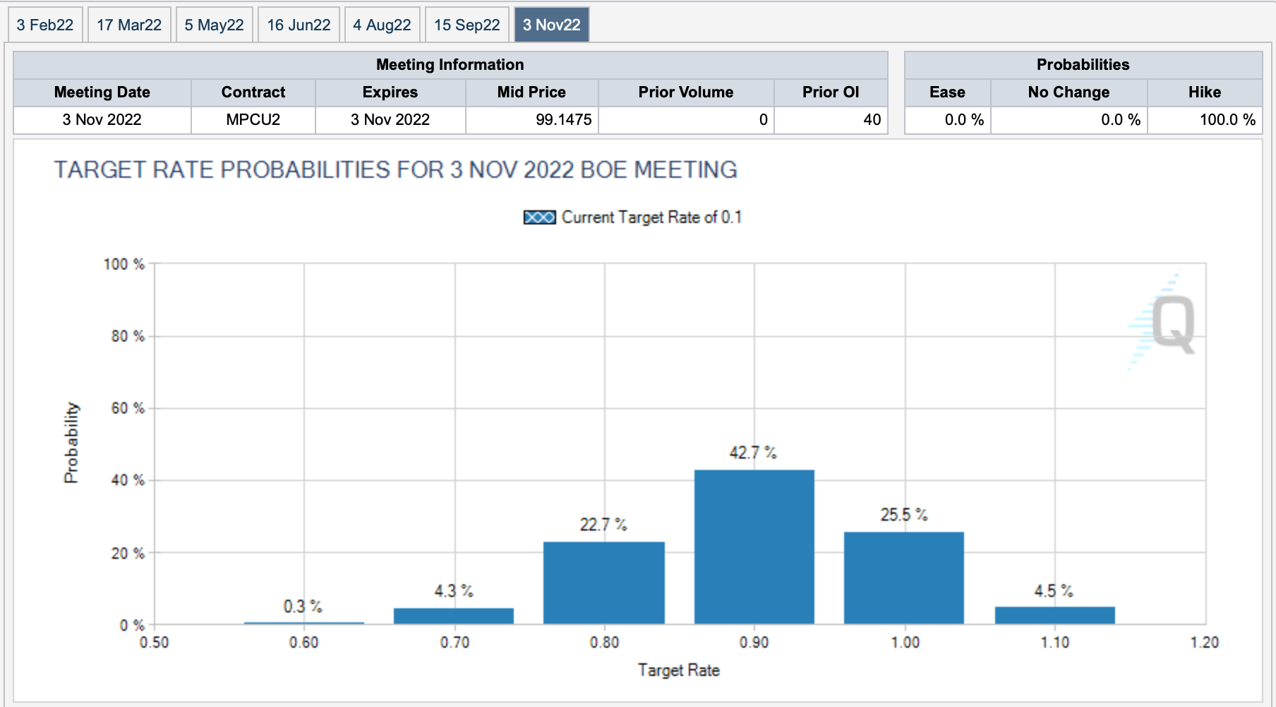 Согласно данным на рисунке выше, более 70% рыночных участников ожидает, что к 3 ноября 2022 г. процентная ставка будет находиться на уровне 0,90% и выше. Напомним, что с 16 декабря 2021 г. ставка находится на уровне 0,25%.