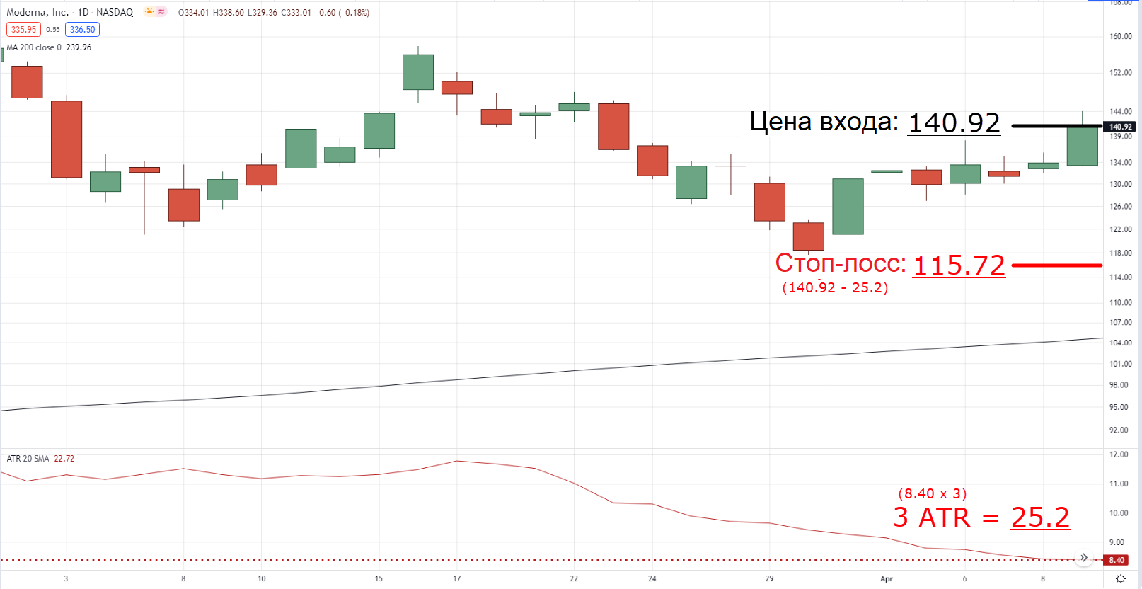 Здесь можно использовать индикатор Average True Range и мультипликатор 3ATR в качестве буфера. Как им пользоваться?