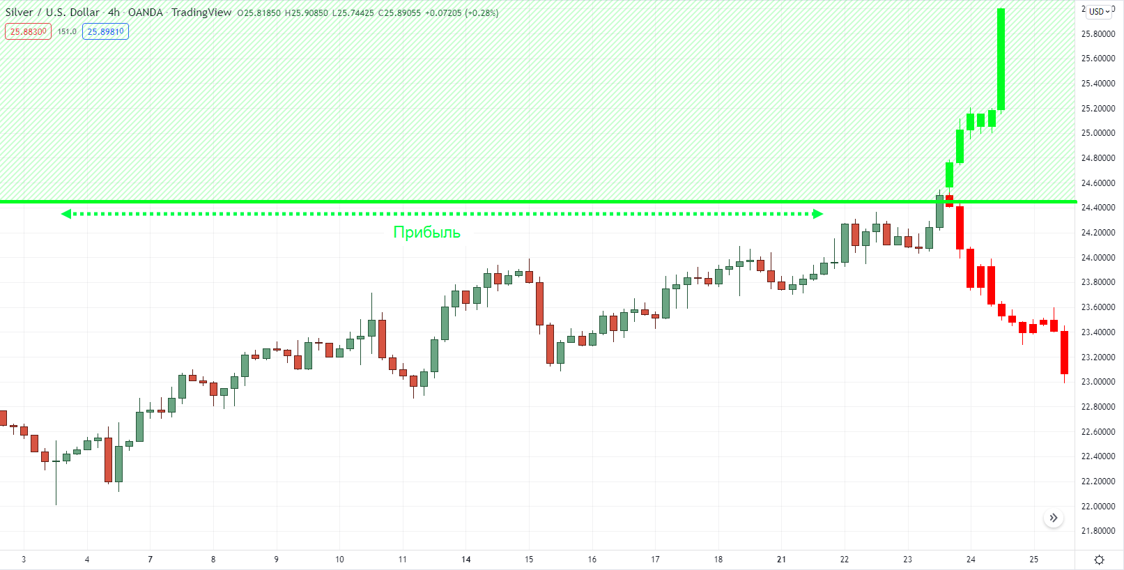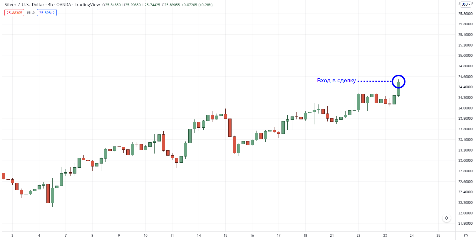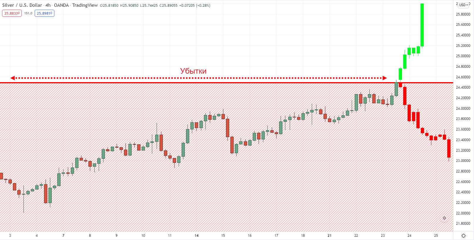 Допустим, сейчас вы в проигрышной полосе. У вас открыта сделка по серебру на 4-часовом таймфрейме:
