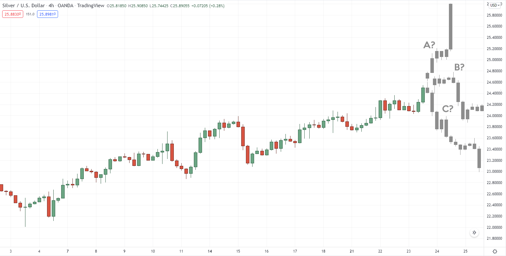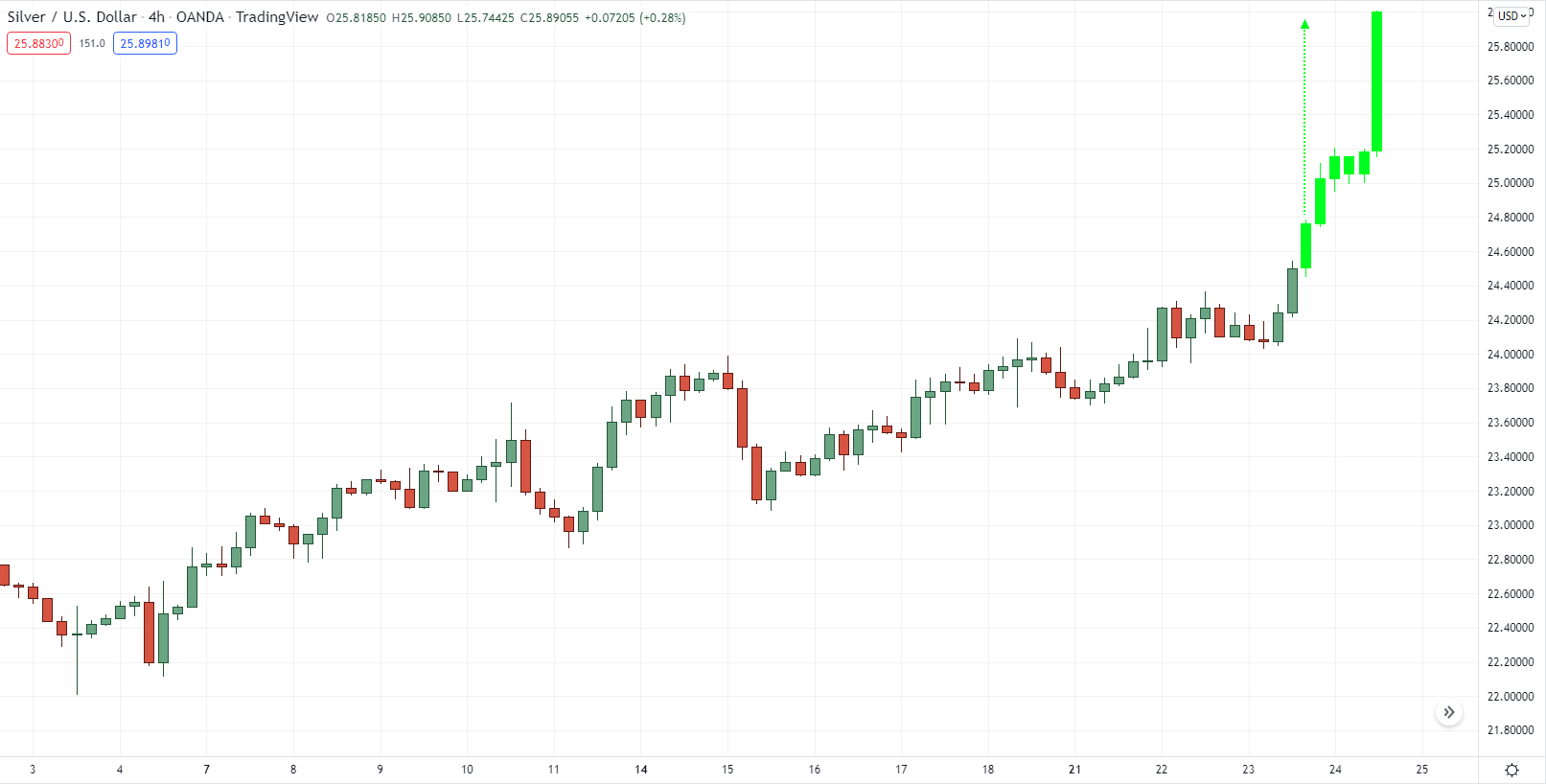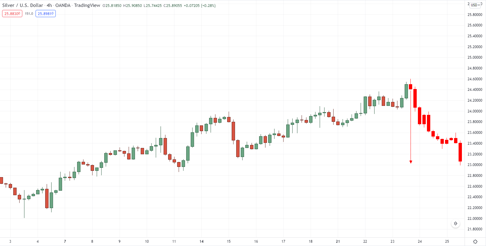 Допустим, сейчас вы в проигрышной полосе. У вас открыта сделка по серебру на 4-часовом таймфрейме:
