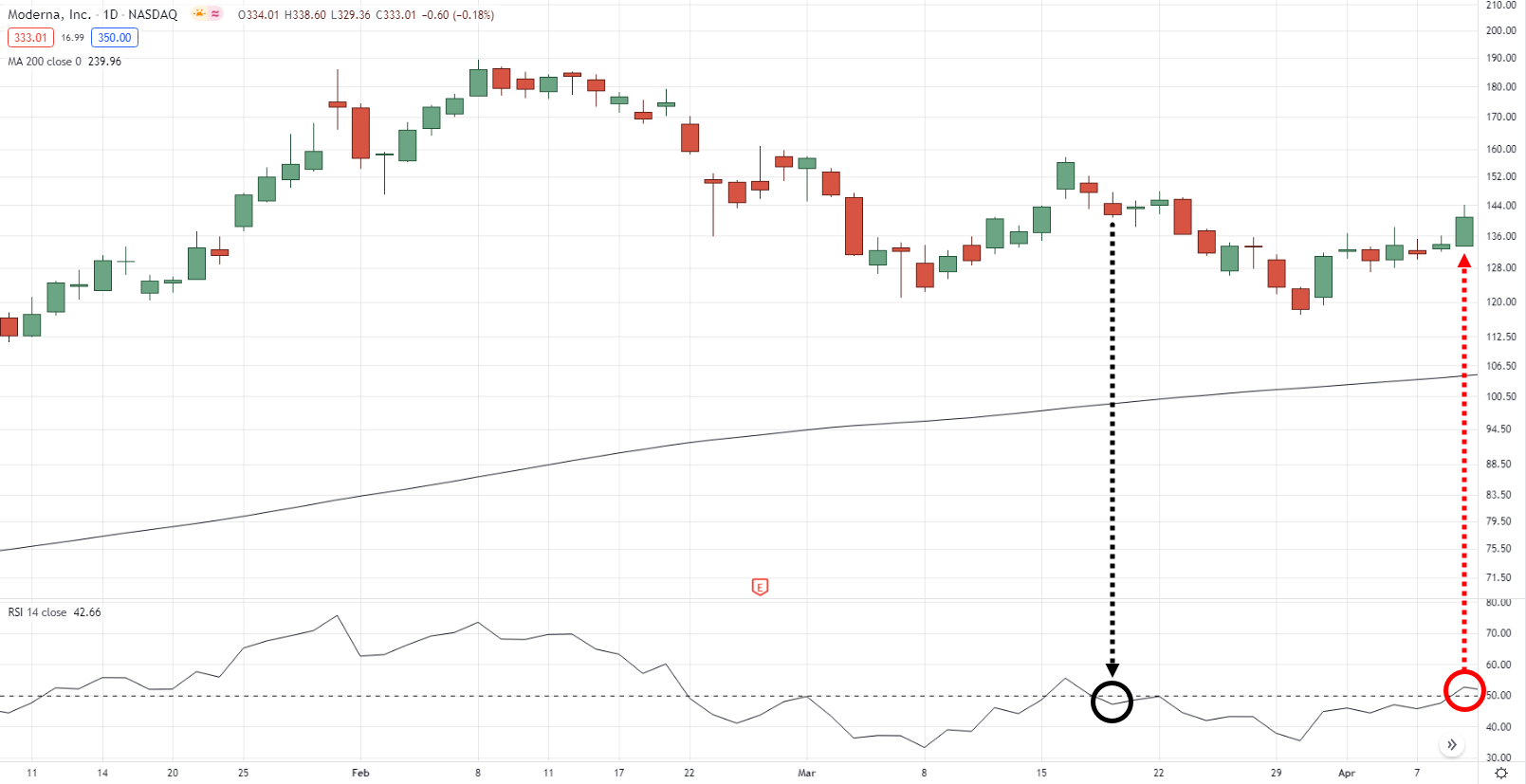 Здесь можно использовать 14-периодный индикатор индекса относительной силы. Например, так: вы ждете, пока цена не закроется ниже RSI50, затем входите в сделку:
