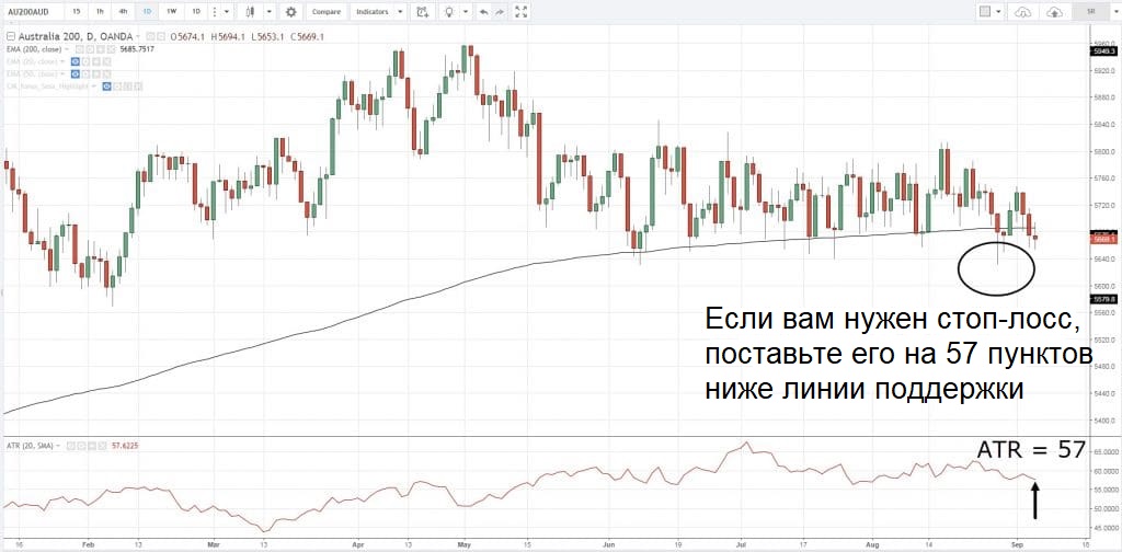 Если вы открыли длинную сделку от линии поддержки и у вас кратность, равная 1, ставьте стоп на 1ATR ниже минимальных значений поддержки.