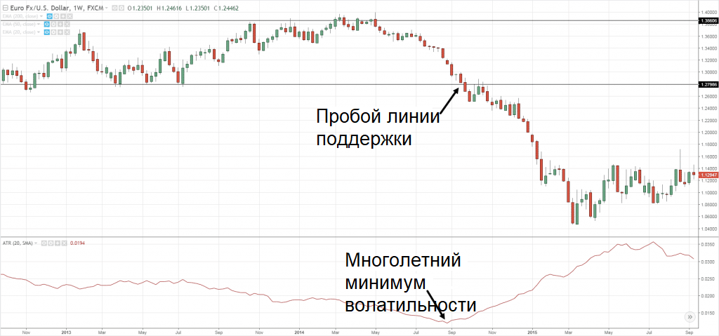 Многолетняя низкая волатильность EUR/USD с последующим пробоем поддержки: