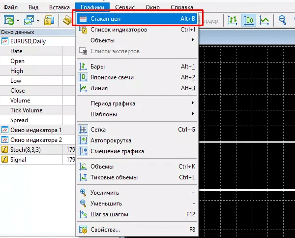 Выбор стакана цен в терминале MT5. Пара EUR/USD.