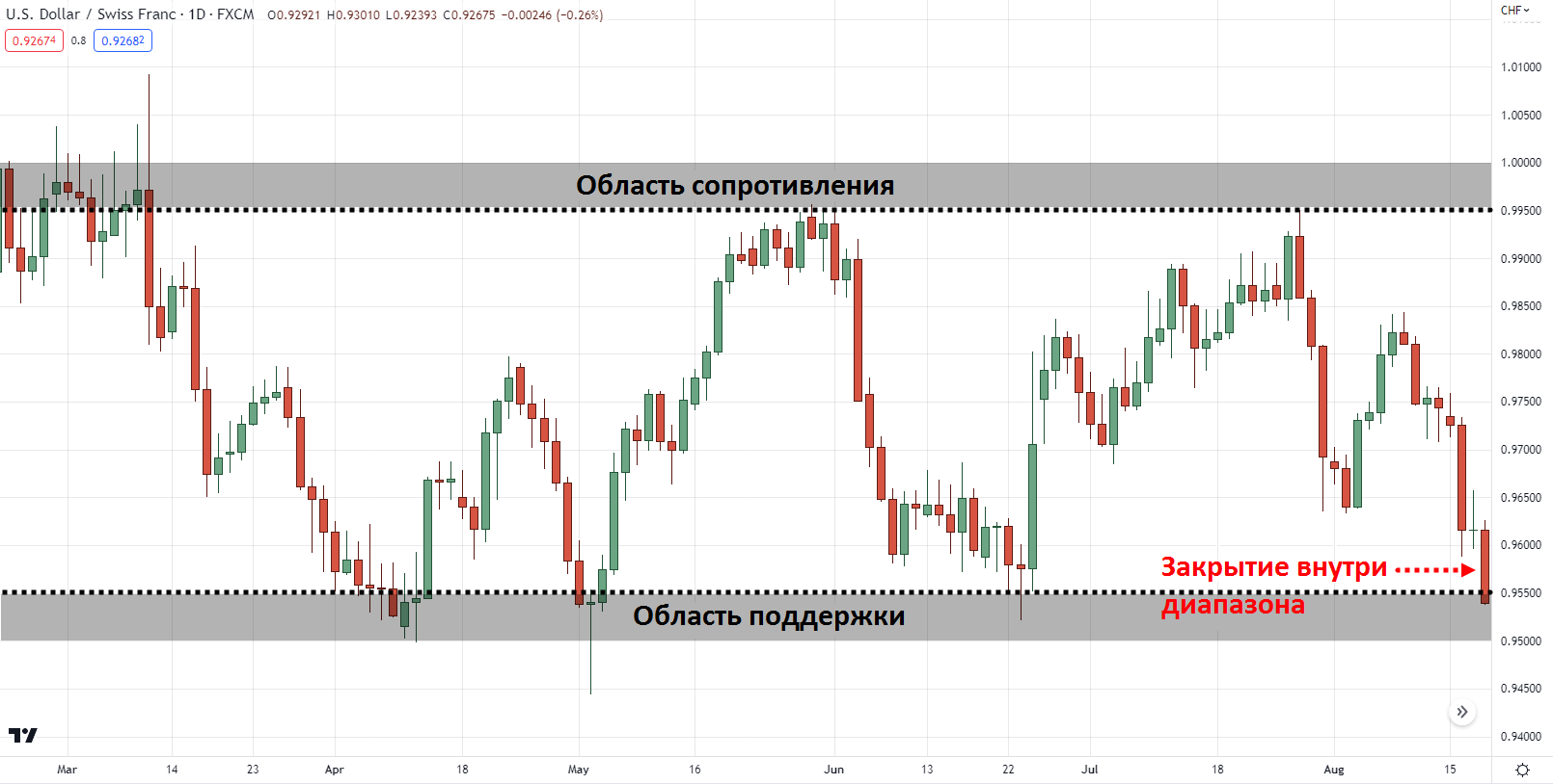 - Подождите, пока цена закроется внутри или за пределами области поддержки/сопротивления.