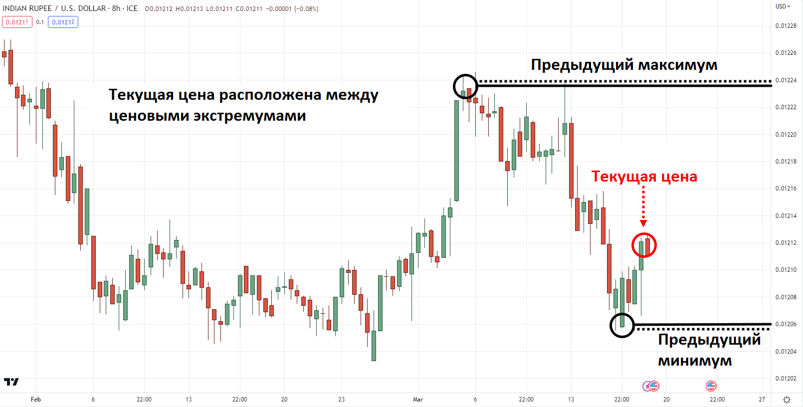 На графике выше — действующий боковой рынок! Почему? Текущая цена в моменте находится в середине диапазона!