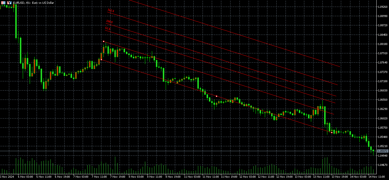 Все остальные уровни призваны показать потенциальные зоны разворота — можно заметить, что у этих границ цена действительно замирает на некоторое время. Но такой вид индикатора не дает возможности предположить, как долго будет длиться тренд. Если вы хотите торговать по тренду, а не на коррекциях, линию следует чертить от конца тренда к началу. Тогда вы получите следующее изображение.