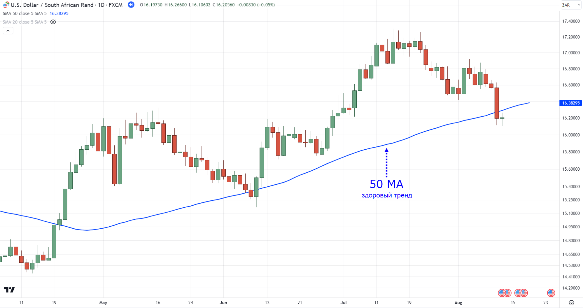 Используйте скользящую среднюю с периодом 50 для систематического выявления доминирующего тренда на рынке.