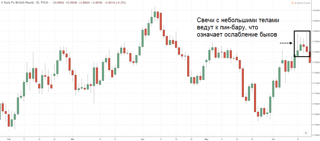 Но если вы видите слабый импульс, за которым следует огромный медвежий пин-бар — это, вероятно, будет разворотом (поскольку предыдущие свечи указывают на то, что быки слабеют).