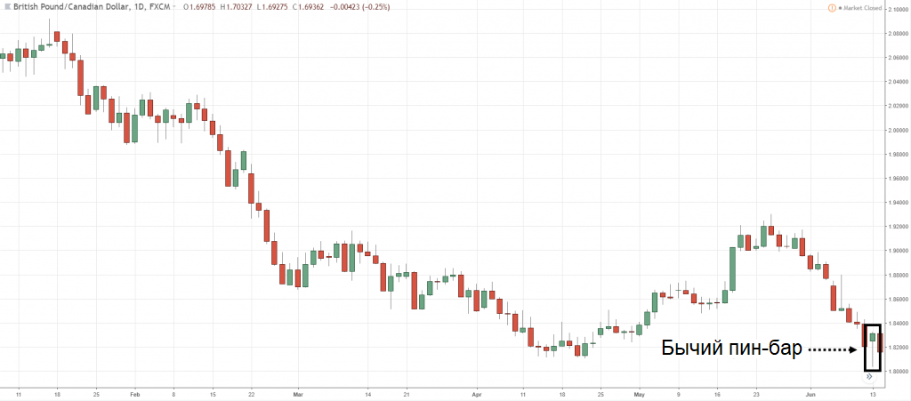 Динамика котировок валютной пары GBP/CAD и паттерн бычий пин-бар.