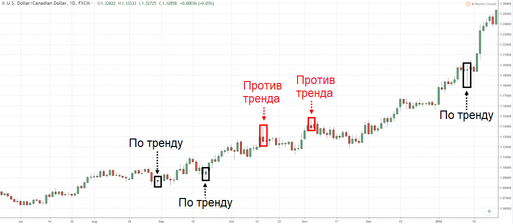 Растущий тренд не развернется просто потому, что там появился, например, медвежий пин-бар. Для разворота тренда нужны более серьезные аргументы.
