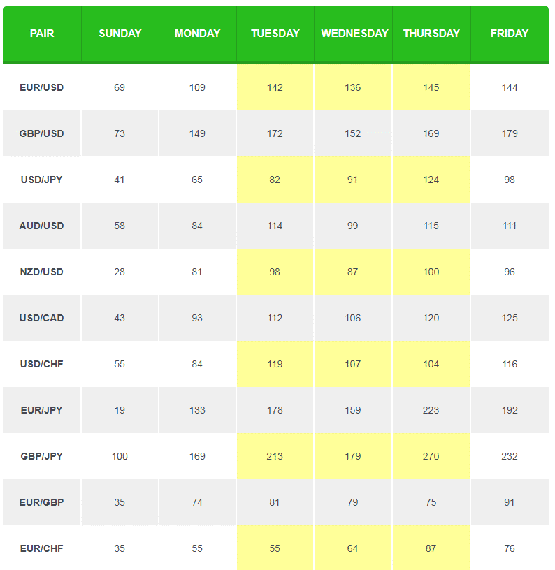 • Середина недели чаще генерирует максимально объемную торговлю на фоне расширения диапазона пунктов по большинству пар.