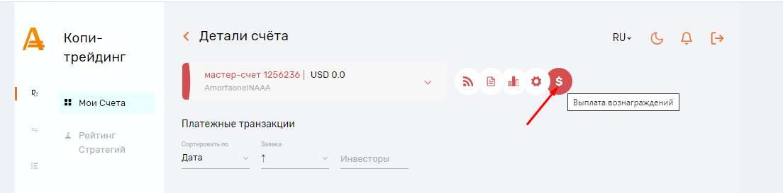 Увидеть все выплаченные вознаграждения можно в сервисе Копи-трейдинга. В разделе «Мои счета» выберите свою стратегию и перейдите в раздел «Выплата вознаграждений».
