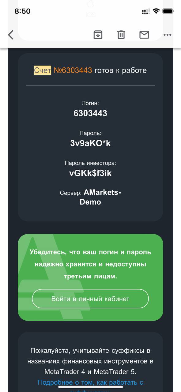 Войдите в свой email и в строке поиска введите заголовок «Вы открыли демо счет в AMarkets»: